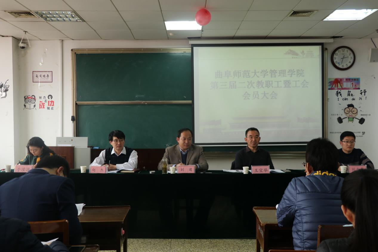 1月12日,管理学院召开第三届二次教职工暨工会会员大会,学院党委书记刘进、院长王宜举、党委副书记赵杰出席会议,全体教职工参加会议。