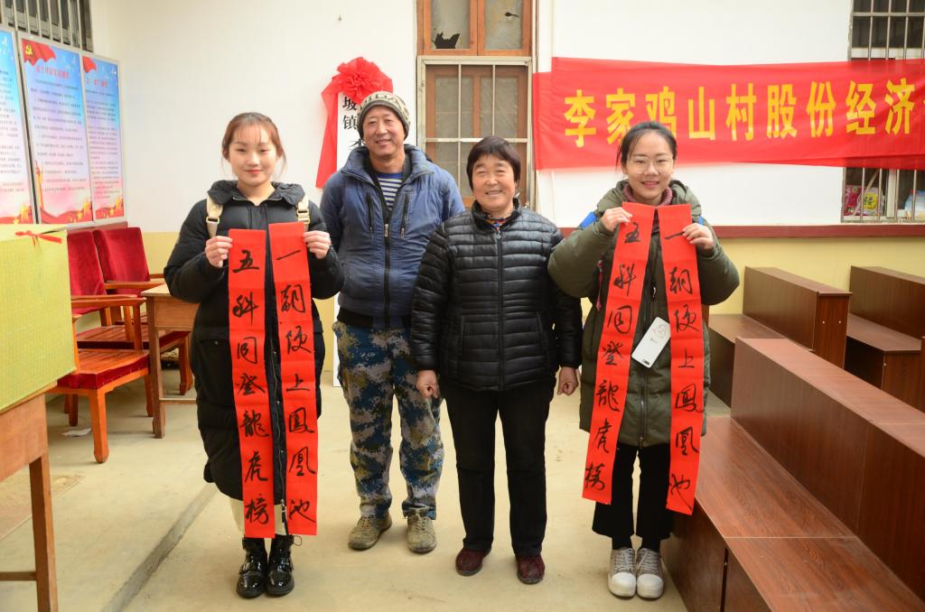 下午,两支部共同开展了“优秀传统文化下乡,促进乡村文明和谐”和“送歌舞送欢笑送春联送祝福”文化宣传活动。学生工作处(武装部)党支部为李家鸡山村村民量身定制了“万善德为本、百行孝为先”专题小课堂,送去了书法学院学生书写的百幅春联,并带去了大学生艺术团表演的精彩节目。寒冷的天气抵挡不住乡亲们的热情,村民接踵而至,纷纷领取春联,认真聆听讲座,观看节目,场面热闹非凡。