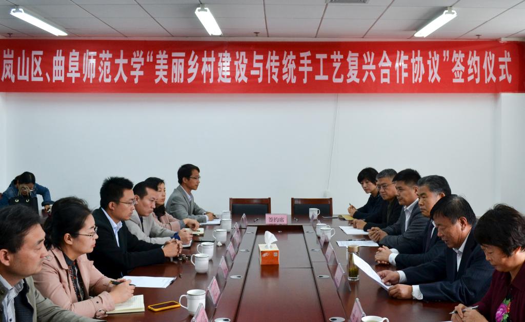11月4日上午,我校与日照市岚山区举行“美丽乡村建设与传统手工艺复兴”合作签约仪式。副校长扈庆学,岚山区政府党组成员王纪军、岚山区文体旅游局局长刘丽以及区委宣传部、人社局、教育局等有关负责人,我校美术学院党委书记刘敏、美术学院副院长宋润民等出席签约仪式。