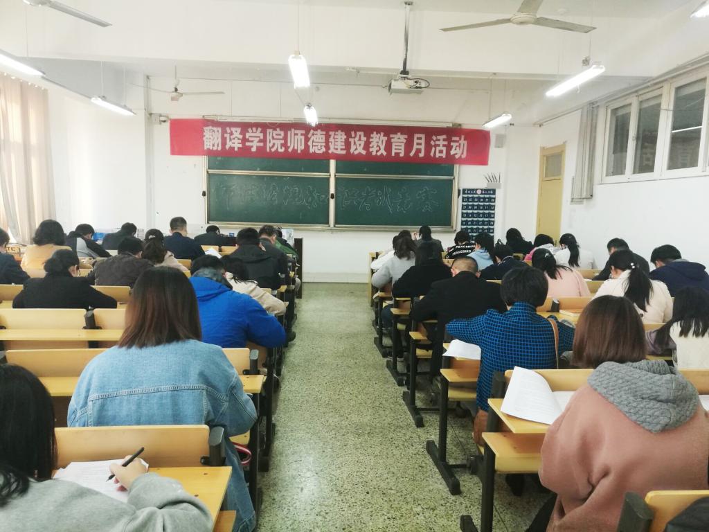 翻译学院本年度师德教育建设活动由走访慰问优秀荣休教师、全院师德法规知识考试竞赛、师德标兵和最美教工与全院教职工的师德经验交流会三部分组成。本次活动以“党”的十九大为指导,以做“四有好老师”为主题,以习近平《在北京大学师生座谈会上的讲话》、《教育法》、《高等教育法》、《教师法》、《高校教师职业道德规范》、《国家教育规划纲要》等法规文件中有关师德的要求为主要考试内容。
