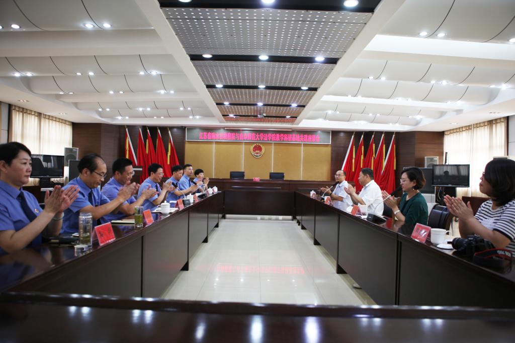 曹明亮与陈宏成分别代表D体育在线登录官网法学院和响水检察院进行了签约并为教学科研基地揭牌。