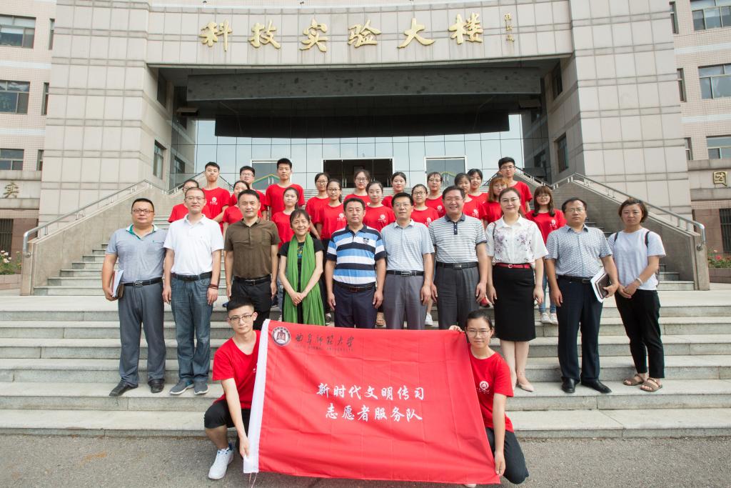 7月16日上午,我校与北京乐和社会工作服务中心协力共建成立的“大学生新时代文明传习志愿者服务队”出征仪式如期举行。北京乐和社会工作服务中心主任廖晓义,曲阜市委宣传部,我校宣传部、国内合作处、学生工作处等单位负责人以及全体志愿者学生参加了出征仪式。仪式由国内合作处处长孔宪福主持。