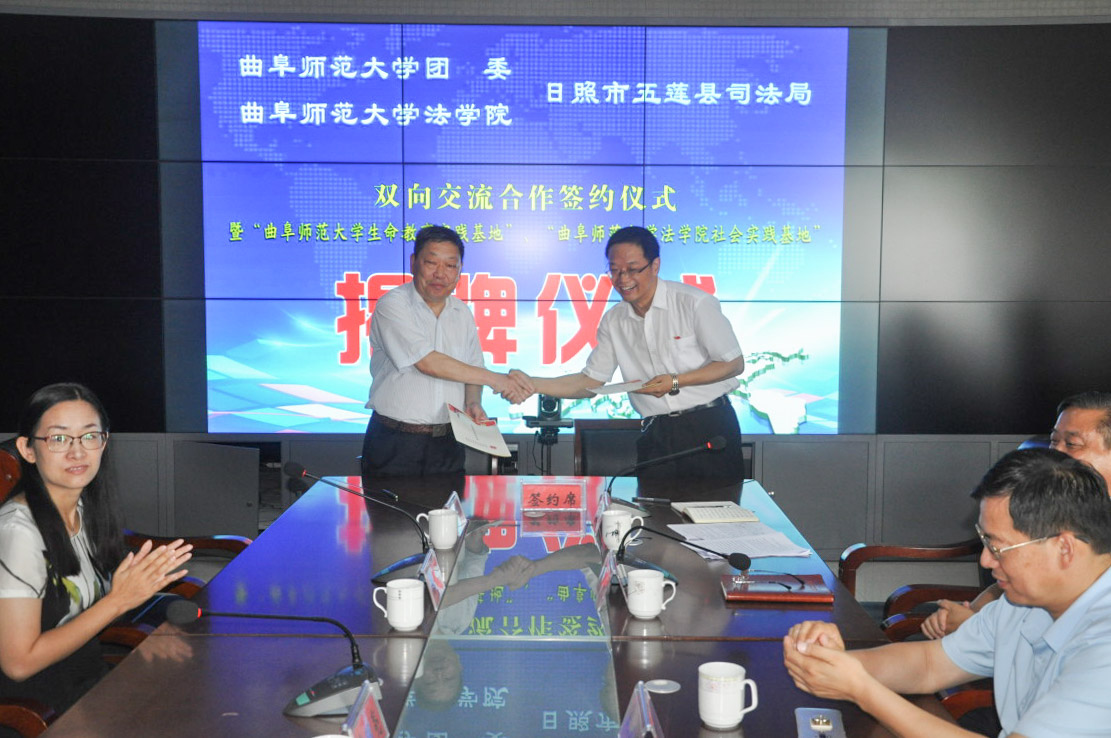 7月12日上午,我校团委、法学院与五莲县司法局举行双向交流合作签约仪式暨“D体育在线登录官网生命教育实践基地”、“D体育在线登录官网法学院社会实践基地”揭牌仪式。法学院党委书记曹明亮,校团委副书记刘蓉,法学院党委副书记卢瑞霞,日照市司法局党委委员、副局长刘书荣,五莲县政府副县长、公安局长史文明出席签约仪式。仪式由五莲县司法局局长王文华主持。