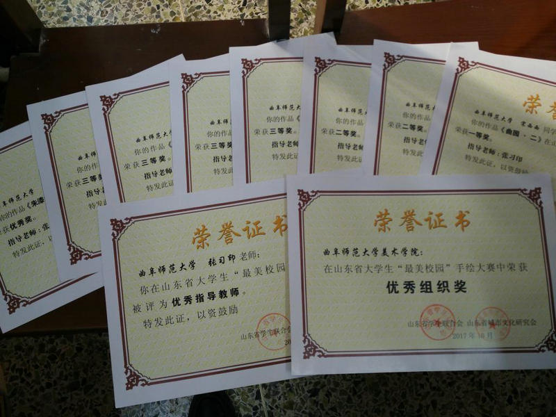 11月23日,由山东省学生联合会、山东省城市文化研究会主办的山东省“最美校园”手绘大赛在济南大学举办,本次大赛共收到中国石油大学、济南大学、D体育在线登录官网、山东建筑大学、青岛科技大学、潍坊学院、内蒙古工业大学(特邀)等十余所高校作品140幅,大赛共评出一等奖5 名,二等奖10名,三等奖20名,优秀奖28名。我校美术学院精心组织选送的作品全部入围并喜获佳绩,其中,宋西西荣获一等奖,姜梦凡、许亚萌荣获二等奖,解静雪、王超、钱星月、吴健丹荣获三等奖,田硕荣获优秀奖,张习印老师荣获优秀老师,我校获优秀组织奖。