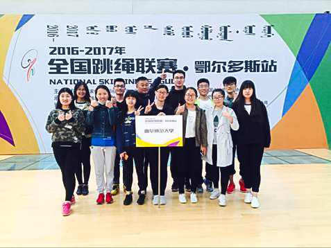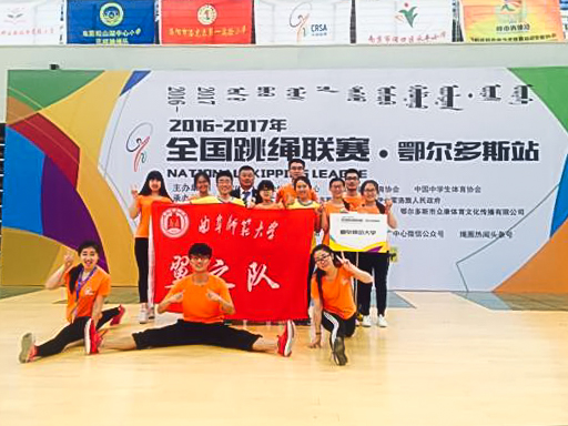 5月12日至15日,由国家体育总局社体中心、全国大学生体育协会和全国中学生体育协会联合主办的2017年度全国跳绳联赛在鄂尔多斯举行。我校由非体育专业学生组成的花样跳绳队在教练李大新、伊士礼老师的带领下参加了此次比赛。