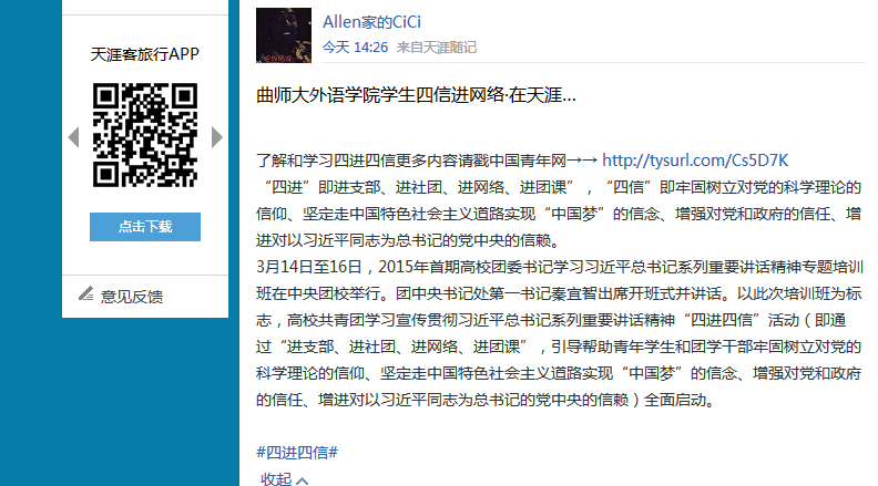 暑期,D体育在线登录官网外国语学院“四进四信”宣讲小分队一行人在青年网民居多的贴吧,天涯论坛,微博等网络公众平台,根据青年网友对习近平十八大讲话以来关于“四进四信”活动内容的认知情况,充分利用网络资源和舆论影响力通过发帖、动态和调动大家参与讨论等多路径方式展开了近一个月的宣传教育工作,旨在提高中国青年网民的思想理论水平,并借此践行中央的“四进四信”精神,营造积极向上的网络舆论氛围。