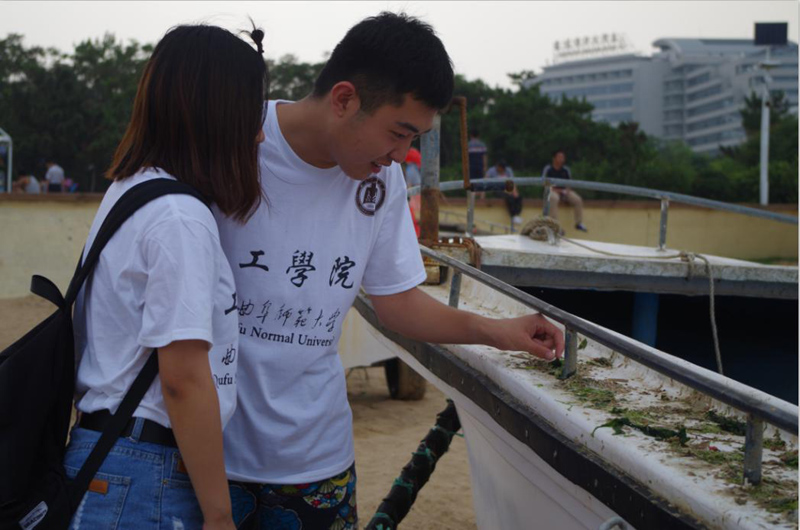 进行过充分的前期准备与资料查阅,7月17日下午,工学院“绿野仙踪,生态山东”社会实践调研团首站在日照市王家皂开启了本次以以“关注绿色生态,建设美丽中国”为主题的暑期社会实践之旅。通过实地走访与调查,实践队发现日照沿海浒苔的过度繁殖对海洋生物造成了极坏的影响,致使大量海洋生物,例如海龟、海豚的死亡。同时由于每日清理浒苔的工作量过大,清理工作不能及时有效地完成,这也为旅客的出行增添了许多不必要的困扰。