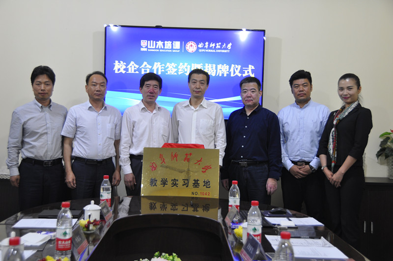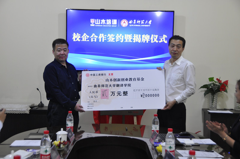 5月19日上午,翻译学院在山木培训集团建立教学实习基地揭牌暨“山木创新创业教育基金”设立仪式在山木培训(中国 济南)大观园校区举行,我校学生处、日照校区学生工作办公室、翻译学院、信息科学与工程学院相关负责人及山木培训集团总裁王总、人才部负责人参加活动。