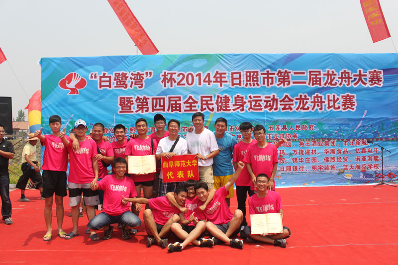 为弘扬传统文化,共度端午佳节,5月31日,由日照市体育局主办的2014年“白鹭杯”日照市第二届龙舟大赛在美丽的市北经济开发区白潮河岸边举行。我校代表队团结一心,奋勇争先,一路劈波斩浪,最终取得男子组500米第三名,男子组200米第四名的佳绩。 我校龙舟队有14名队员,由杨弢教授为领队,刘刚、李宗涛两位老师指导,从5月份开始就制定了科学的训练计划,在潮白河和帆船基地进行集结训练,并邀请前国家划艇队员夏志刚教练现场指导。本次活动共有23支来自各行业的代表队,300余名运动员参加,5000余名观众观看此次龙舟盛会。
