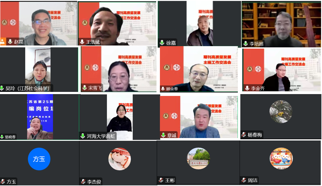 曲阜师大期刊中心讯 为提高《齐鲁学刊》办刊质量和水平,更好策划选题,也为更好学习宣传党的二十大精神,实现期刊高质量发展,《齐鲁学刊》编辑部于11月30日举办“期刊高质量发展·主编工作交流会”。《南京大学学报(哲学·人文科学·社会科学)》《东南大学学报(哲学社会科学版)》《湖南师范大学社会科学学报》《江苏社会科学》《南京农业大学学报(社会科学版)》《南通大学学报(社会科学版)》《河海大学学报(哲学社会科学版)》《中国矿业大学学报(社会科学版)》《南京工业大学学报(社会科学版)》等期刊主编和相关负责人应邀参会。会议由《齐鲁学刊》主编赵昆教授主持。