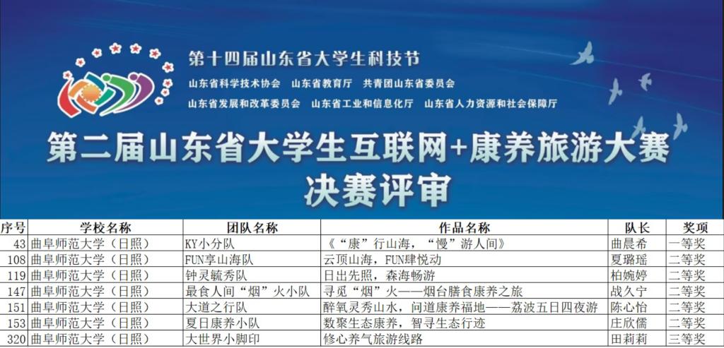 曲阜师大地理与旅游学院讯 近日,第十四届山东省大学生科技节暨第二届山东省大学生互联网+康养旅游大赛落下帷幕。曲阜师大地理学子表现优异,获一等奖1项、二等奖5项、三等奖1项。