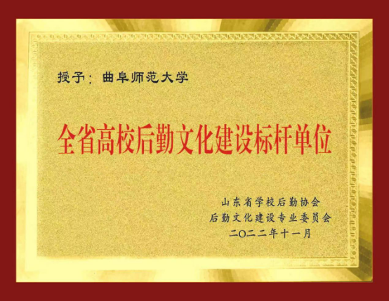 曲阜师大后勤管理处讯 近日,山东省学校后勤协会、后勤文化建设专业委员会公布了《关于公布全省高校后勤文化建设评优结果的通知》,曲阜师大荣获全省“高校后勤文化建设标杆单位”称号。本次评选是首次面向全省高校开展,共评出标杆单位5个、优秀单位4个,曲阜师大特色鲜明、成果丰硕,在评选中名列前茅。