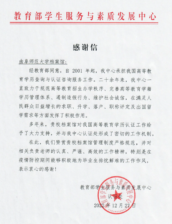 曲阜师大档案馆讯 日前,教育部学生服务与素质发展中心向曲阜师大发来感谢信,对学校档案馆在高等教育学历认证工作方面给予的大力支持表示诚挚感谢。