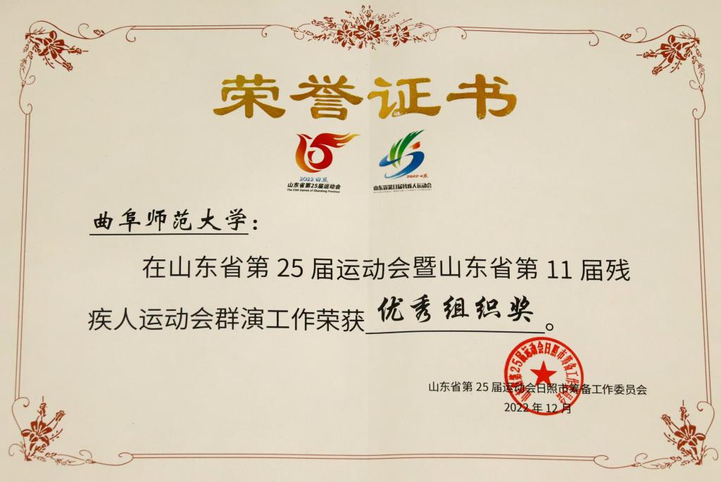 曲阜师大团委讯 在全国第60个“学雷锋纪念日”、第24个中国青年志愿者服务日来临之际,曲阜师大荣获山东省第25届运动会、第11届残运会志愿服务工作优秀组织和群演工作优秀组织奖。