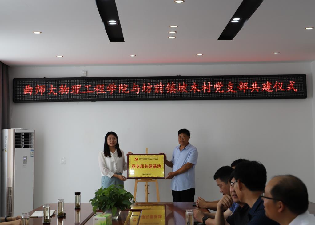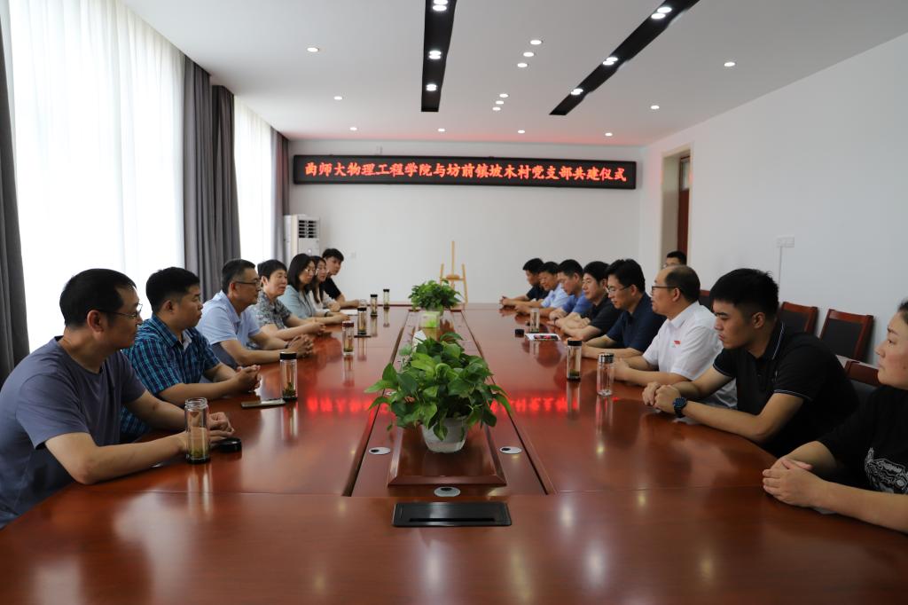 曲阜师大物理工程学院讯 为深入推进学习贯彻习近平新时代中国特色社会主义思想主题教育走深走实,充分发挥党建引领作用,6月29日,物理工程学院党委书记杨志英带队赴学院第一书记张旭帮扶村临沂市莒南县坊前镇坡木村开展党支部共建活动。莒南县人大常委会副主任陈庆金、镇党委书记李永山,学院党委班子成员、本科生第二党支部负责人,D体育在线登录官网派驻坊前镇4名第一书记参加活动。