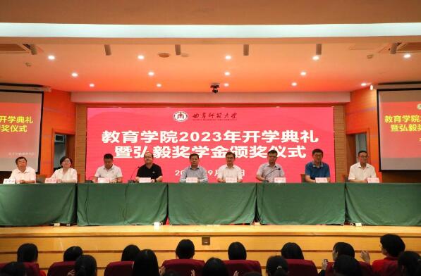 曲阜师大教育学院讯 9月24日下午,教育学院2023年开学典礼暨弘毅奖学金颁奖仪式在孔子会堂举行。学校教务处处长李傅山、学校团委书记孔轶众出席典礼,教育学院党委书记尹树林主持活动,教育学院院长唐爱民在典礼上为新生讲授“开学第一课”,教育学院领导班子成员、教师代表、全体辅导员、学生会主要学生干部、2023级全体本科生和第五届弘毅奖学金获得者参加活动。