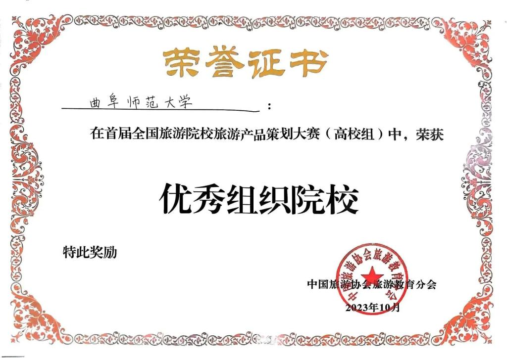 地理与旅游学院讯 近日,由中国旅游协会旅游教育分会主办的首届全国旅游院校旅游产品策划大赛全国总决赛落幕。曲阜师大地理与旅游学院张腾霄、甘唯萌、安琪、姚娜等同学的作品“源起千年,鸣响今朝”荣获一等奖,其他5支队伍获二等奖和优秀奖,田青、陈锋、赵岩、张乃宁等4位老师分获最佳指导老师和优秀指导老师,学校获优秀组织院校奖。