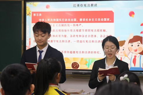 宣讲进小学,行动促认识。12月4日,法学院师生先后走进日照市金海岸小学和古城小学开展宪法宣传活动。现场观摩和指导古城小学模拟法庭和法治辩论赛。为了更好地持续推进青少年法治教育,法学院与古城小学共建劳动教育实践基地正式揭牌,为法治教育宣传和普及贡献了曲园力量。
