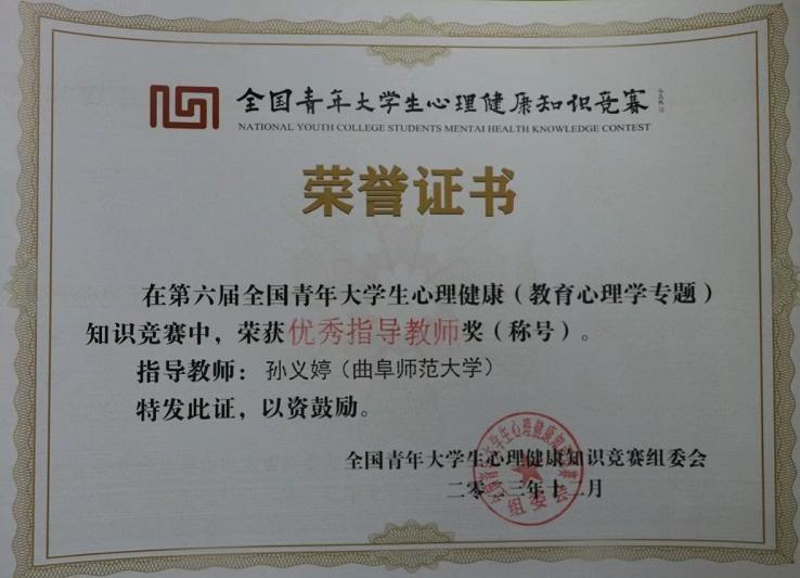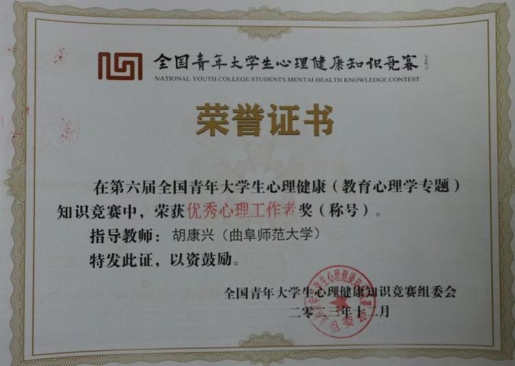 曲阜师大经济学院讯 12月5日,第六届全国青年大学生心理健康(教育心理学专题)知识竞赛圆满落下帷幕。经济学院积极组织学生参与本次大赛,共177名学生获奖,其中一等奖32人、二等奖52人、三等奖61人、优秀奖32人,经济学院喜获第六届全国青年大学生心理健康知识竞赛“优秀组织单位”,辅导员胡康兴被评为优秀心理工作者,辅导员孙义婷荣获优秀指导教师并被聘任为全国青年大学生心理健康知识竞赛专家指导委员会青年专家委员。