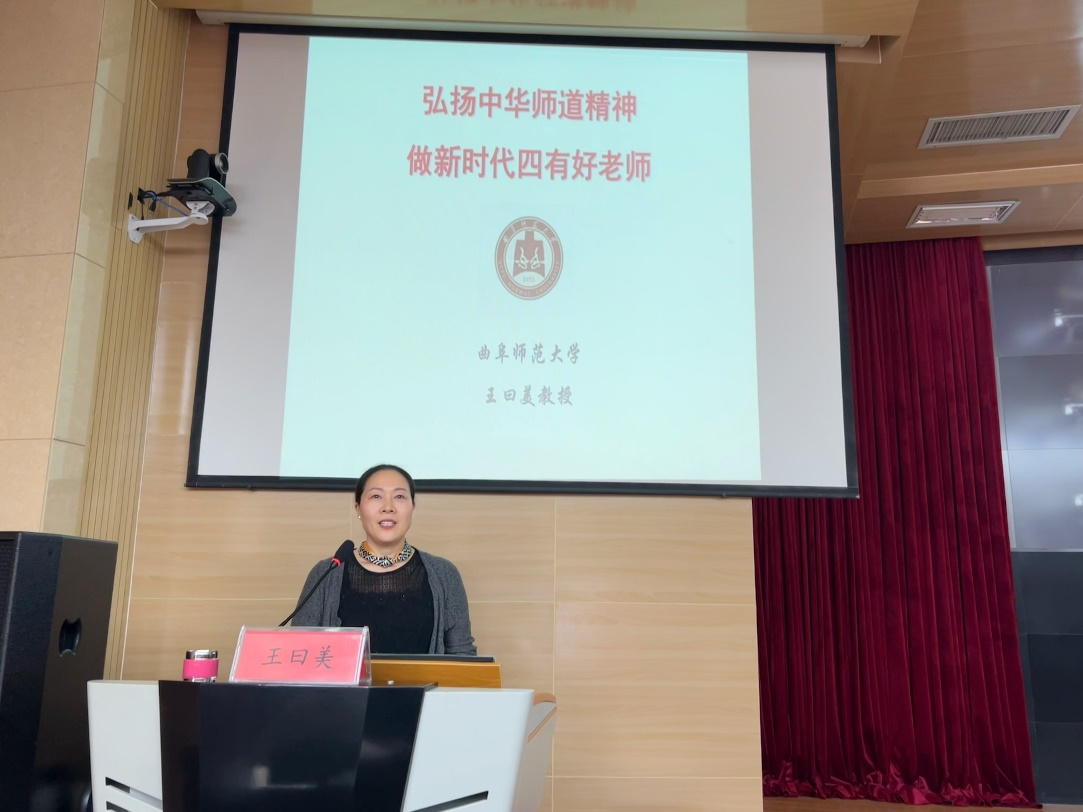 王曰美教授发挥校地处孔子故里的优势,选择了孔子为人师表作为讲座的切入点,在讲座中以“至圣先师——孔子”的生平与教育智慧为契机,将中华师道精神与新时代“四有好老师”的要求紧紧结合在一起,从“坚定理想信念、具备扎实学识、拥有仁爱之心”三个方面生动形象地向学员们展开了讲解。