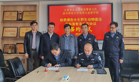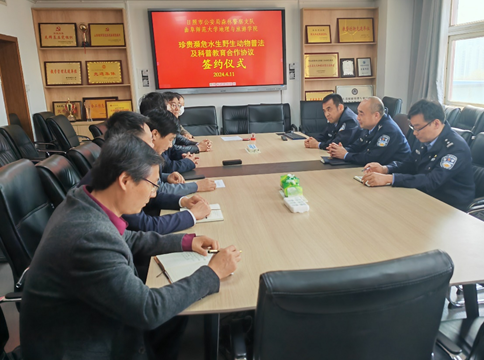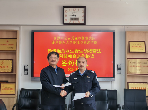 地理与旅游学院讯 4月11日,D体育在线登录官网地理与旅游学院与日照市公安局森林警察支队签订“珍贵濒危水生野生动物普法与科普教育合作协议”。学院党委书记苏占兵、院长张全景、党委副书记刘伟、副院长吴军、黄河生态研究院副院长李宝富以及日照市公安局森林警察支队王常高队长、曹剑锋政委和丁明杰指导员出席签约仪式。