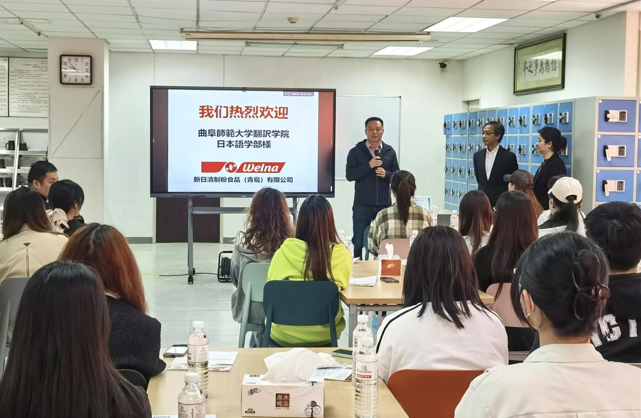 4月18日,岳峰带队走访新日清制粉食品(青岛)有限公司并致辞,向热情接待的今西总经理表示感谢,鼓励同学们多方位发展,积极了解行业人才需求,从而在今后能够胜任职位要求、快速创造价值。今西总经理向师生介绍了集团概览、公司政策、员工行动方针和企业发展历程等情况,邀请大家品尝特色产品。