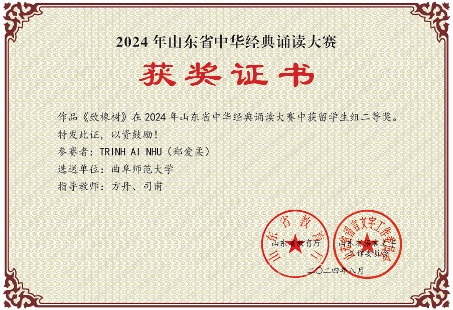 经过初赛、复赛的激烈角逐,曲阜师大留学生在诸多参赛选手中脱颖而出,其中VU THUY LINH(武垂玲)、NGUYEN THI THANH HANG(阮氏青恒)获得留学生组一等奖;TRINH AI NHU(郑爱柔)获得二等奖;潘丽丽、王文娟两位老师获得优秀指导教师奖。