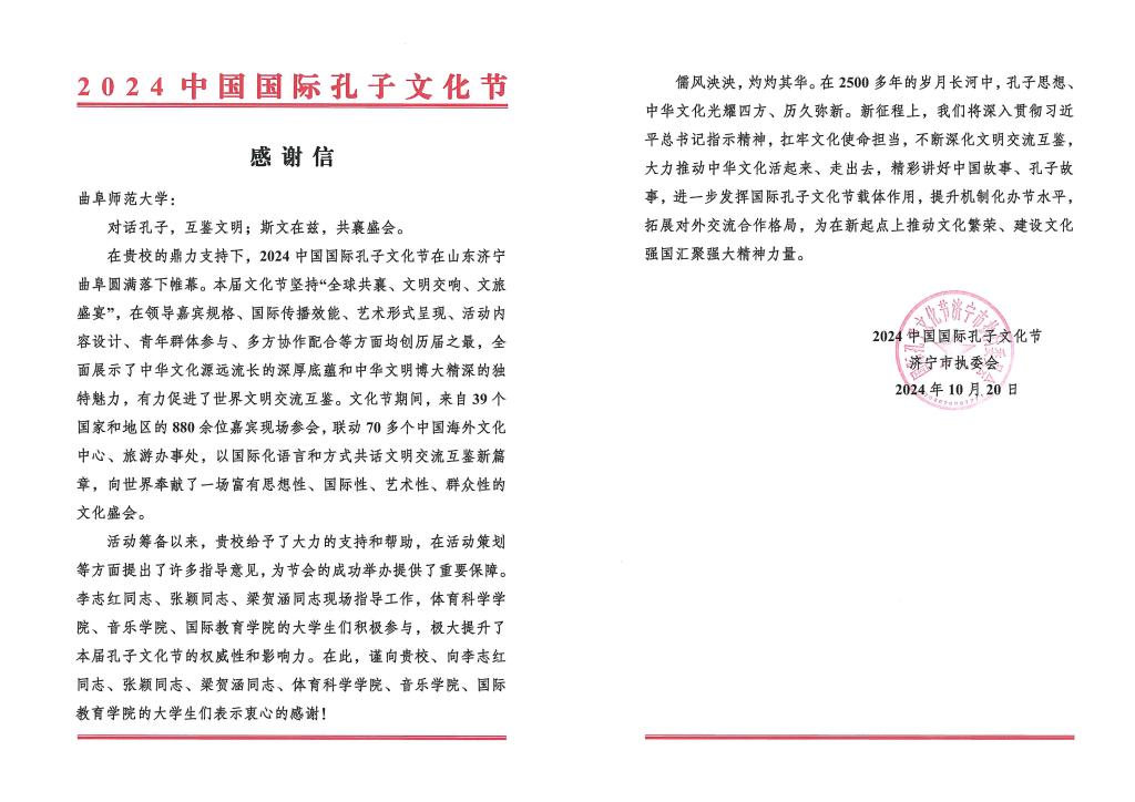 日前,曲阜师大收到来自2024中国国际孔子文化节济宁市执委会的表扬信,对学校在活动筹备、志愿服务保障中的精心组织表示诚挚感谢。