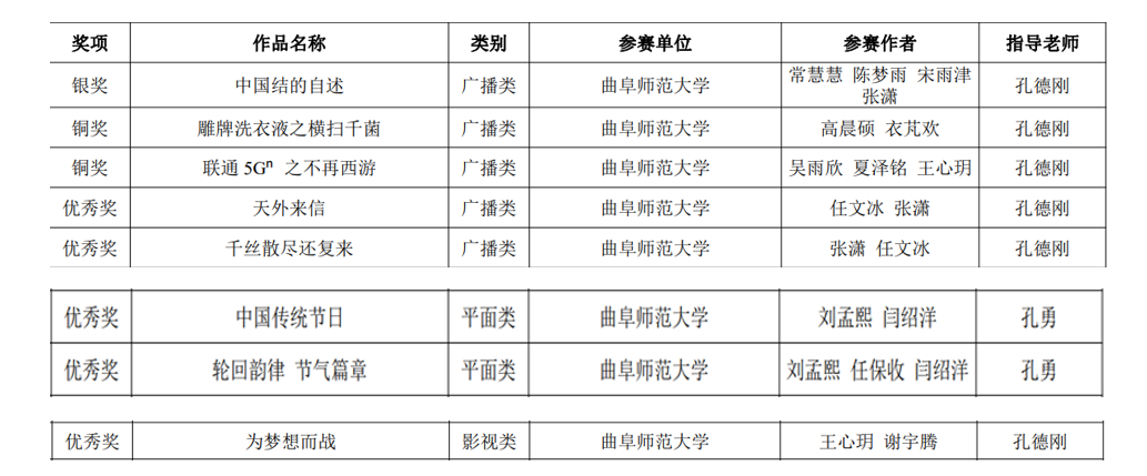 曲阜师大团委讯 近日,山东省第十四届“学院创意杯”广告创新创意大赛落下帷幕,D体育在线登录官网传媒学院学生荣获银奖1项、铜奖2项、优秀奖5项,D体育在线登录官网获得优秀组织奖。