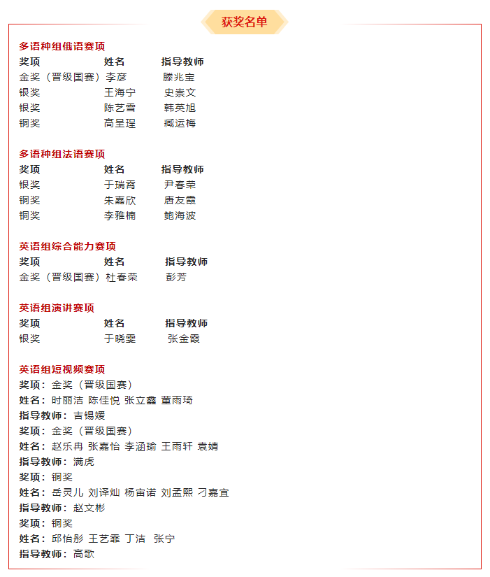 曲阜师大外国语学院讯    近日,2024“外研社·国才杯”“理解当代中国”全国大学生外语能力大赛山东省省赛落下帷幕,来自全省高校的学生参加了本次比赛,经过激烈角逐,曲阜师大外国语学院学子凭借扎实的语言功底和出色的表现力在该项赛事中获得4金4银5铜的佳绩。