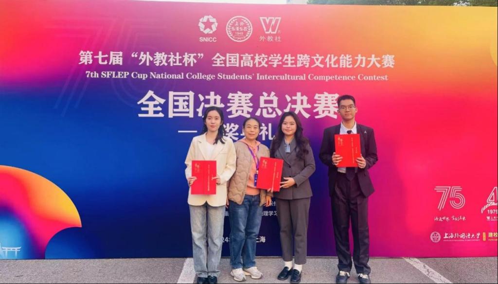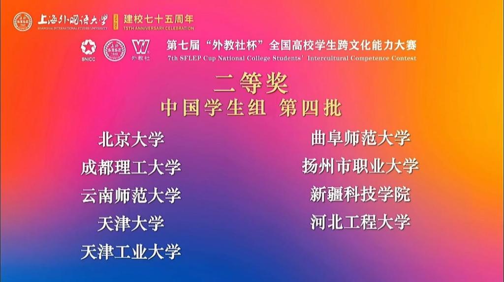 曲阜师大公共外语教学部讯 11月28日至12月1日,第七届“外教社杯”全国高校学生跨文化能力大赛成功举办。由巩奕含(统计与数据科学学院)、崔又心(统计与数据科学学院)、杨浩然(外国语学院)组成的D体育在线登录官网代表队荣获全国二等奖,公共外语教学部副教授仲蕾荣获优秀指导教师奖,这是D体育在线登录官网在该项赛事中首次荣获国家级奖项,取得历史性突破。