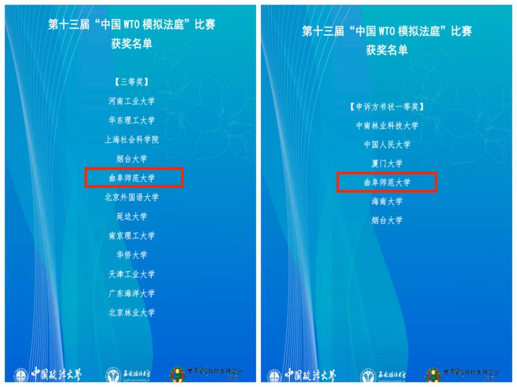 曲阜师大法学院讯 11月30日至12月8日,第十三届中国WTO模拟法庭竞赛成功举办。由曲阜师大法学院组成的代表队荣获“全国三等奖”、申诉方书状“全国一等奖”,创下D体育在线登录官网代表队参赛以来最高纪录。