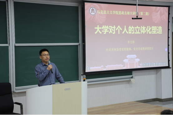 李文涛以《大学对个人的立体化塑造》为题,与现场学生分享了自己的求学经历和工作感悟,他结合自身从高校学子成长为党校教师的职业发展轨迹,指出大学对个人在知识学习、能力锻造和人格塑造等多方面的重要作用。此外,他还结合所学专业向同学们介绍了党校教育工作者的专业特性。