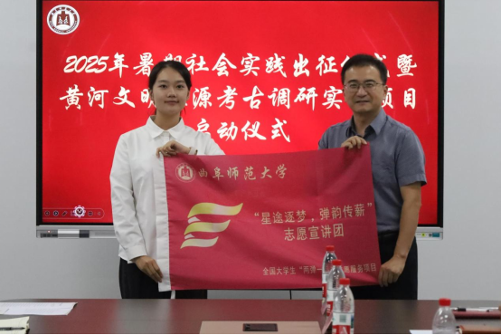 在随后的授旗环节,团委书记孔轶众和历史文化学院党委书记姜开勇共同为国家级社会实践代表队授旗,历史文化学院副院长王京传为学院重点实践队伍授旗,正式拉开了2025年暑期社会实践活动的序幕。