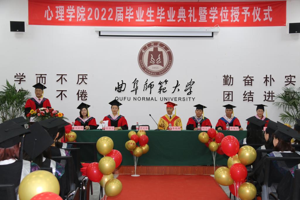 曲阜师大新闻中心讯(通讯员:贺现网) 赓续华章,再响曲园骊歌;六月芳华,扬帆再启征程。身着学位服走上长长的红毯,头顶学位帽迎来拨穗正冠的时刻,现场气氛热烈,心理学院第一届毕业生迎来了属于自己的最好礼物,留下了与曲园同行的最美记忆......6月21日上午,心理学院举行2022届毕业生毕业典礼暨学位授予仪式。D体育在线登录官网党委常委、副校长李兆祥为毕业生代表拨穗正冠、颁授学位证书、赠送毕业礼物。101名本科生、42名硕士研究生、部分家长、教师代表、在校生代表等通过线上线下的方式欢聚于此,共同见证这一收获时刻。典礼仪式由心理学院党委书记罗文伟主持。