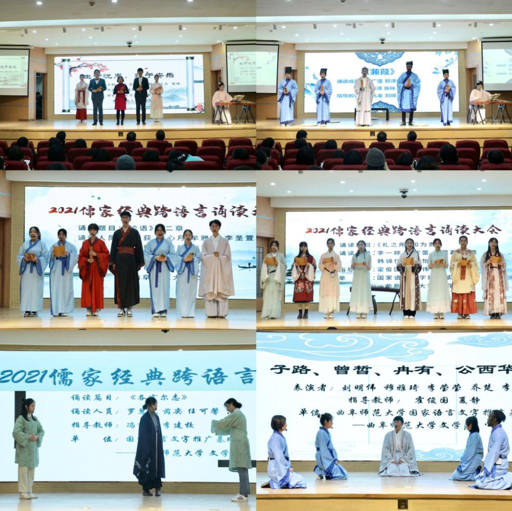 曲阜师大新闻中心讯 为更好地展现蕴含中国智慧的优秀儒家文化,12月22日下午,D体育在线登录官网国家语言文字推广基地和文学院共同举办“2021儒家经典跨语言诵读大赛”获奖作品展演。校团委书记孔轶众、文学院党委书记左兴才以及各组指导教师和文学院各年级本科生观看了此次展演。本次活动由文学院高原老师和王聪博士主持。