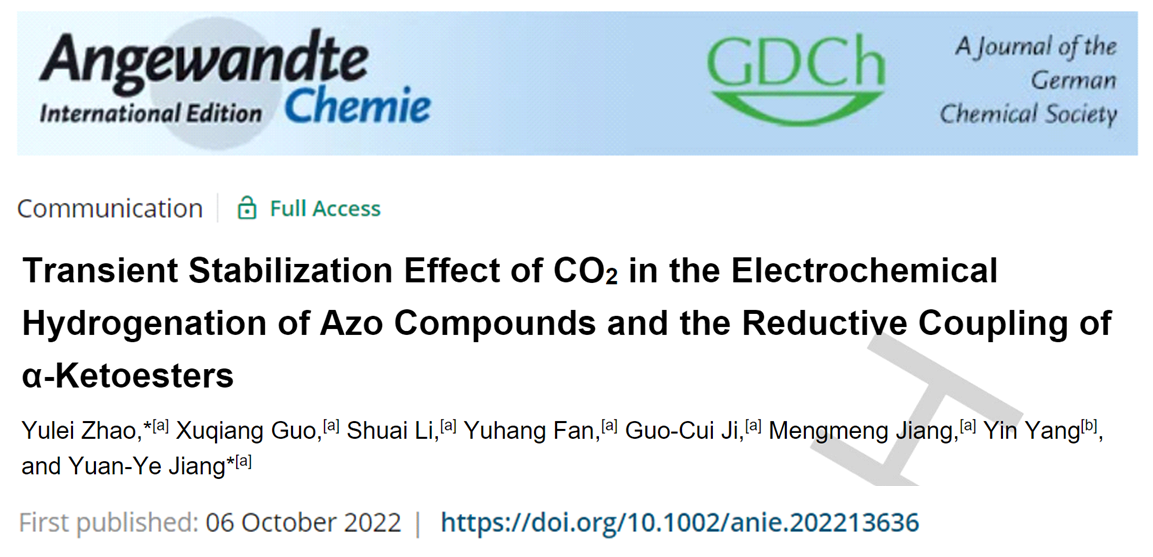 曲阜师大科技处讯 近日,曲阜师大化学与化工学院赵育磊副教授与蒋原野副教授合作,在二氧化碳利用领域取得突破性进展,相关研究成果发表在国际顶级期刊《德国应用化学》(Angewandte Chemie International Edition)上,论文题为“Transient Stabilization Effect of CO2 in the Electrochemical Hydrogenation of Azo Compounds and the Reductive Coupling of α-Ketoesters” (DOI: 10.1002/anie.202213636,文章链接:https://onlinelibrary.wiley.com/doi/10.1002/anie.202213636)。D体育在线登录官网为该论文的唯一通讯单位,赵育磊副教授为该论文的第一作者和通讯作者,蒋原野副教授为该论文的共同通讯作者。《德国应用化学》于1962年由John Wiley and Sons Ltd出版,是化学和材料领域的国际顶级期刊。JCR分区为一区,当前影响因子为16.823。
