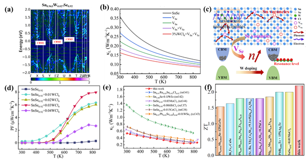 图注: (a) W掺杂和双空位对SnSe能带的影响;(b)多种缺陷对热导率的影响;(c)缺陷对热输运和电输运影响机制示意图;(d)电学性能(功率因子)随温度的变化;(e)热学性能(热导率)随温度的变化;(f)该工作获得的ZT值与文献值的对比。