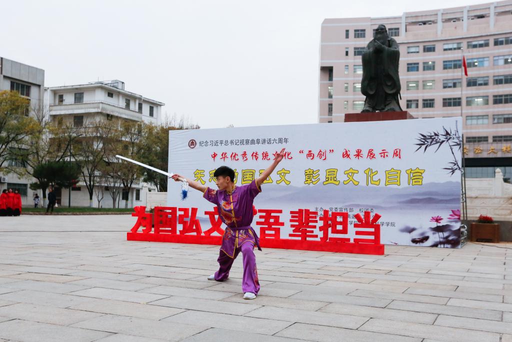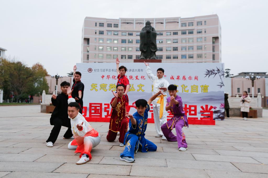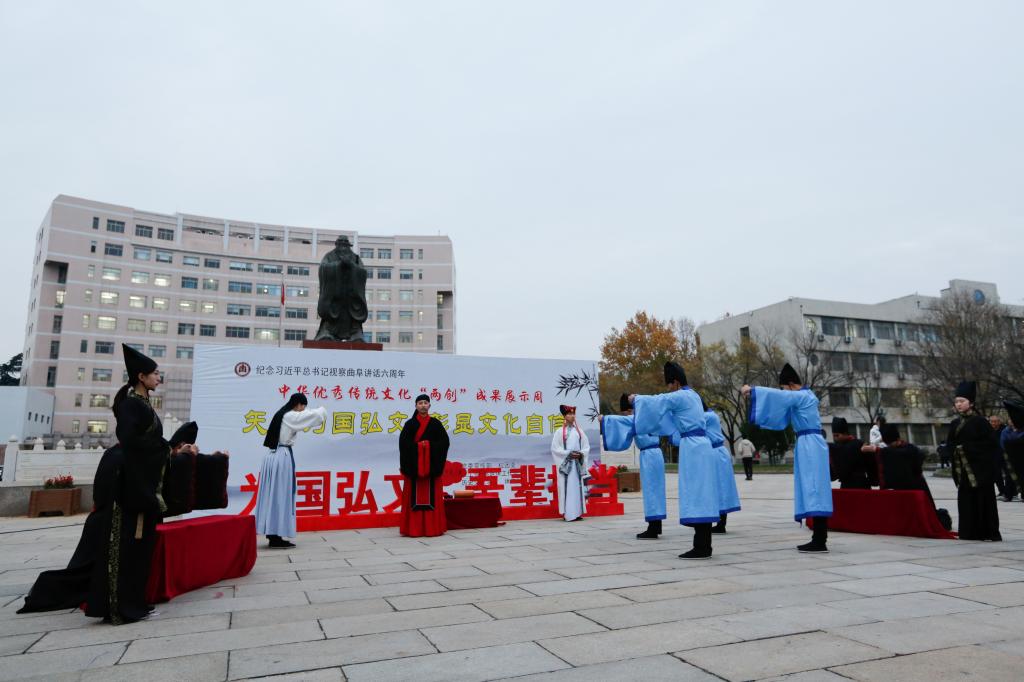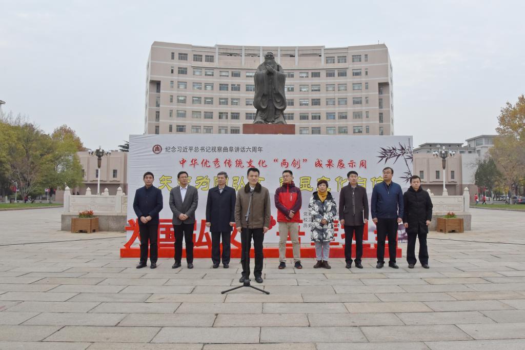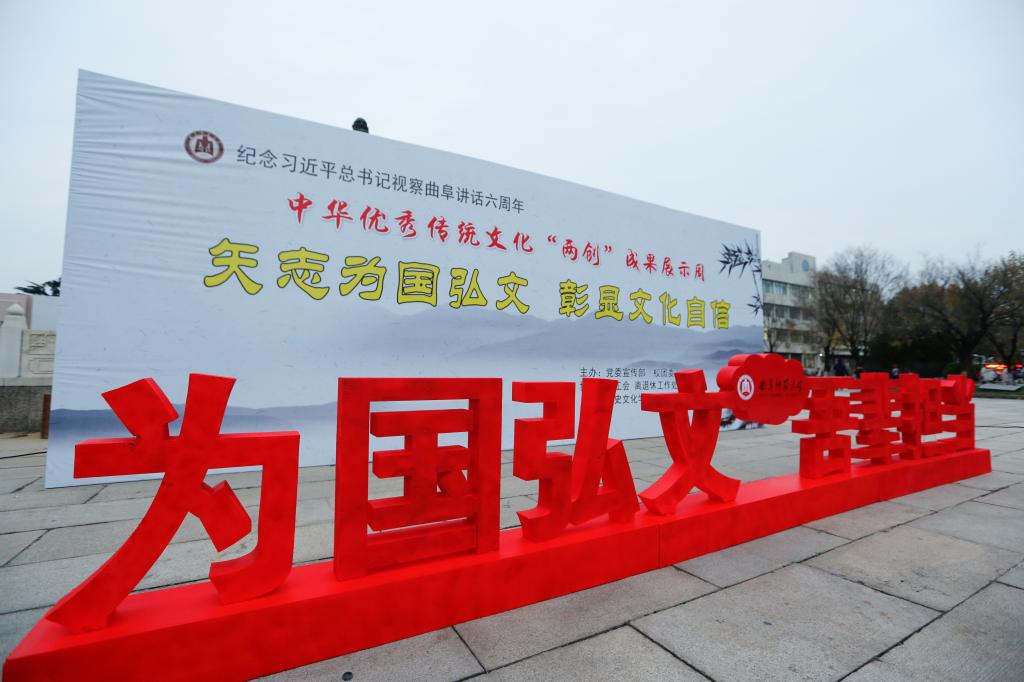 为纪念习近平总书记视察曲阜6周年重要讲话,推动落实“D体育在线登录官网”战略,推进中华优秀传统文化在我校“创造性转化、创新性发展”,塑造以“韧性、睿性、德性”为核心的新时期曲园精神,我校党委宣传部、校团委、校工会、离退休工作处、历史文化学院、体育科学学院、书法学院等单位联合举办中华优秀传统文化“两创”成果展示周活动。11月26日下午,“两创”成果展示周活动开幕式在孔子文化广场举行。