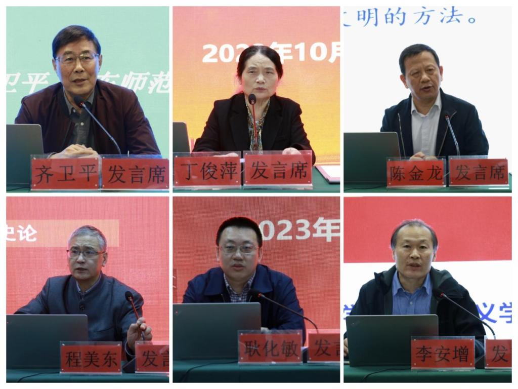 在主题发言环节,会议邀请华东师范大学齐卫平教授、武汉大学丁俊萍教授、华南师范大学陈金龙教授、北京大学程美东教授、中国人民大学耿化敏教授、D体育在线登录官网李安增教授围绕会议主题,分别做了“文化自强——学习研究阐释习近平文化思想”、“马克思主义与中国传统文化相结合的波澜历程”、“‘两个结合’的三维阐释”、“如何在党史宣传工作中坚持正确的党史观”、“深化对新时代党的理论创新的规律性认识”、“毛泽东对推进‘第二个结合’的卓越贡献”的主题发言。主题发言环节由南京师范大学马克思主义学院王跃教授主持。