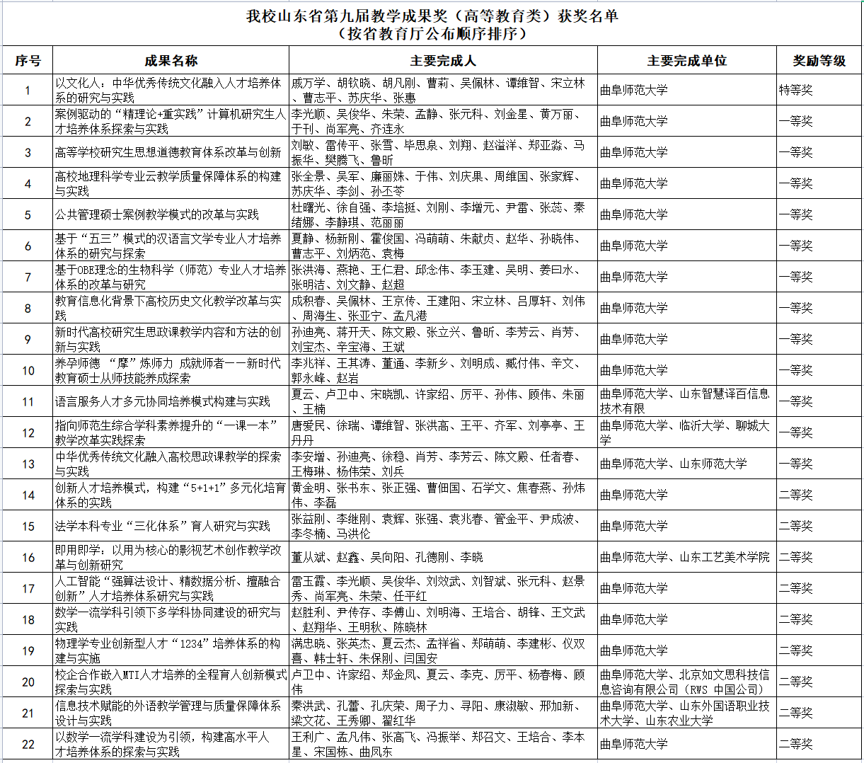 曲阜师大22项成果获批山东省第九届高等教育教学成果奖
